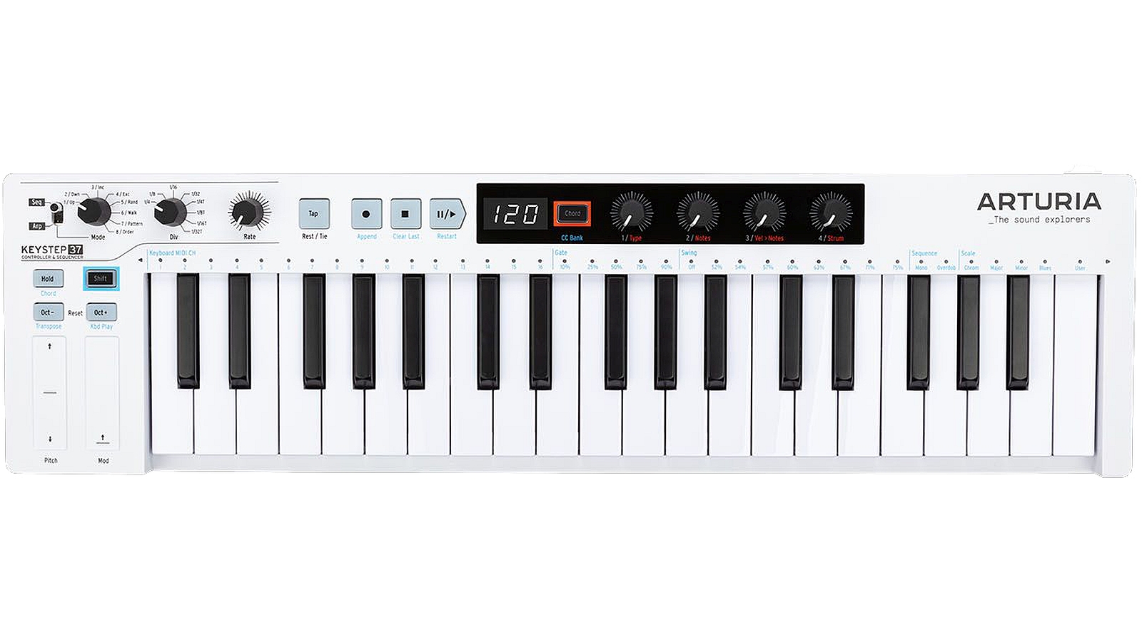 Das KeyStep 37 mit einer Premium-Tastatur mit 37 anschlagdynamischen Tasten und Aftertouch bietet farbcodierte LED-Rückmeldungen und 3 Oktaven in kompakter Form. Kreative Akkord-, Skalen- und MIDI-Funktionen sowie eine erweiterte Benutzeroberfläche mit neuen taktilen Steuerelementen sorgen für ein inspirierendes Spielerlebnis. Das Ergebnis: der bisher coolster Controller.