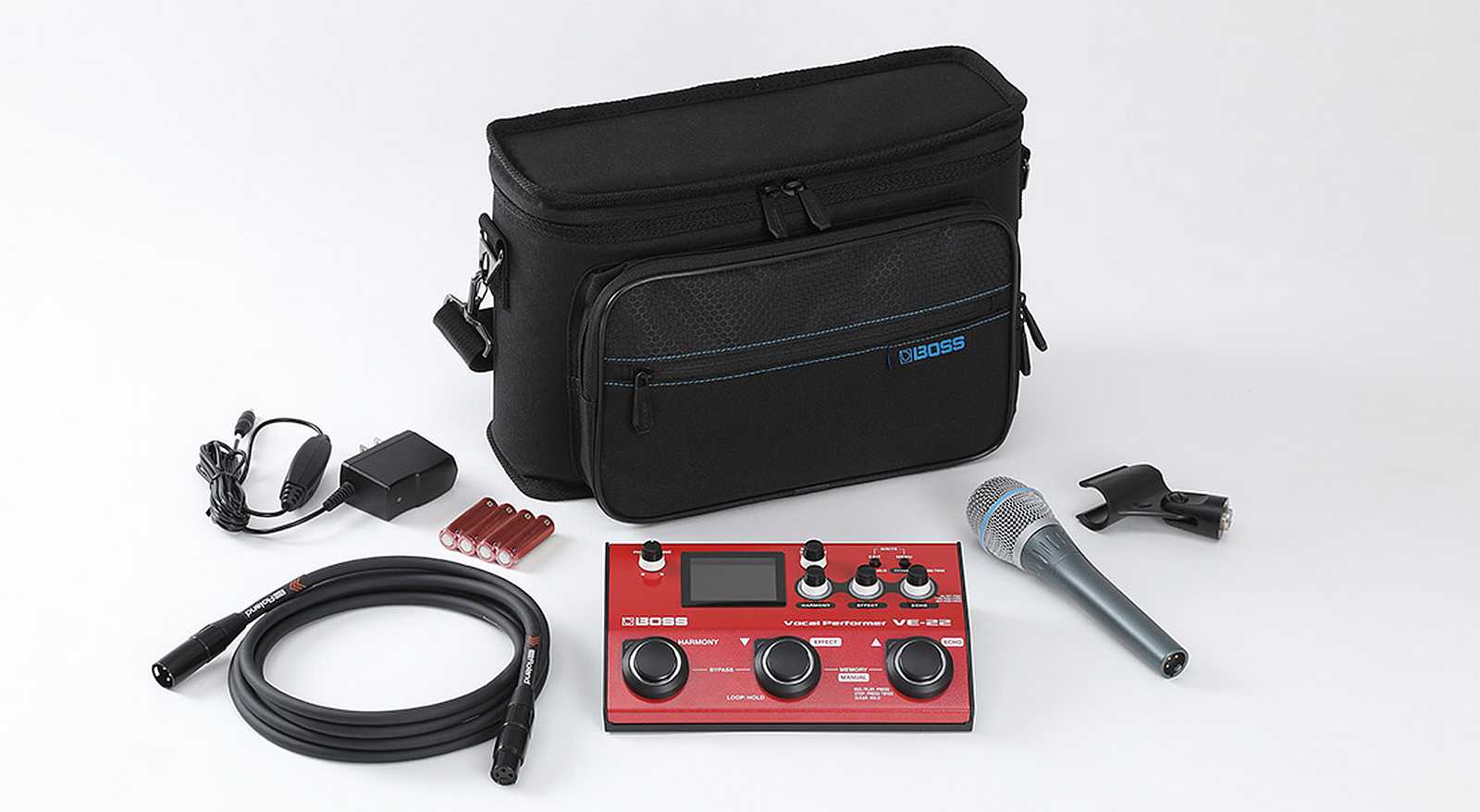 - Bietet Platz für den BOSS VE-22 oder VE-20 Vocal Performer, ein Mikrofon und Zubehör