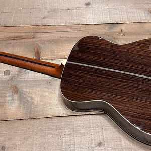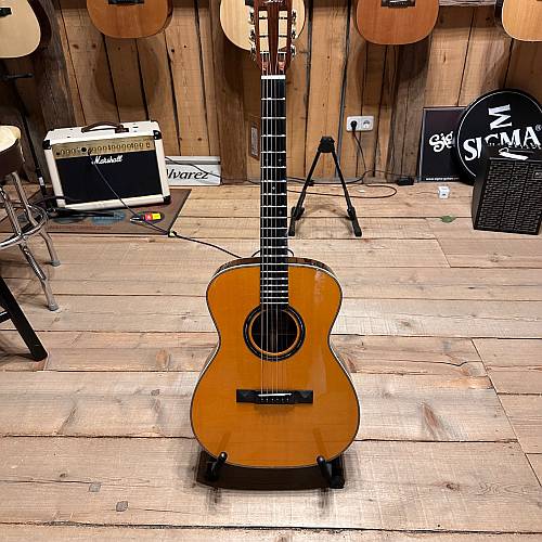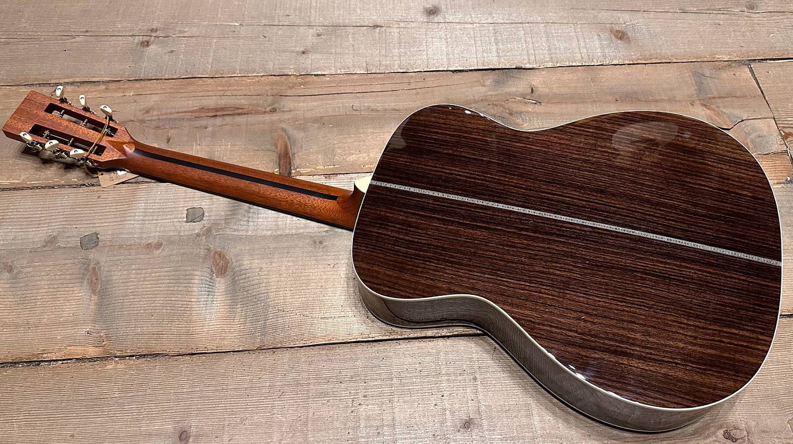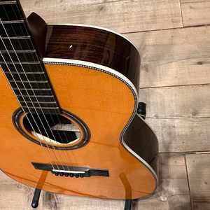 Die massive Alpenfichtendecke aus der Schweiz sorgt für einen warmen, offenen Grundklang mit hervorragender Projektion. Boden und Zargen aus massivem ostindischem Palisander verleihen der Gitarre zusätzliche Tiefe, warme Mitten und langes Sustain – eine klassische Kombination für anspruchsvolle Gitarrist*innen, die Wert auf Natürlichkeit und klangliche Vielfalt legen.