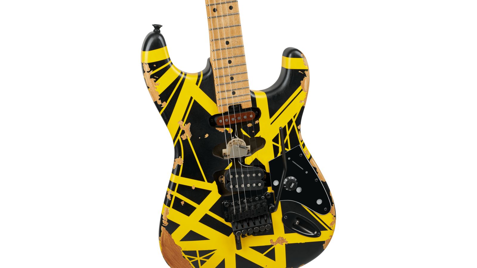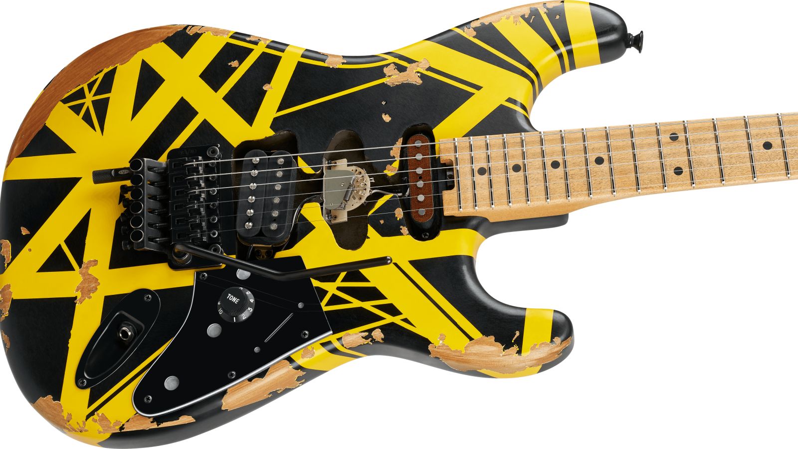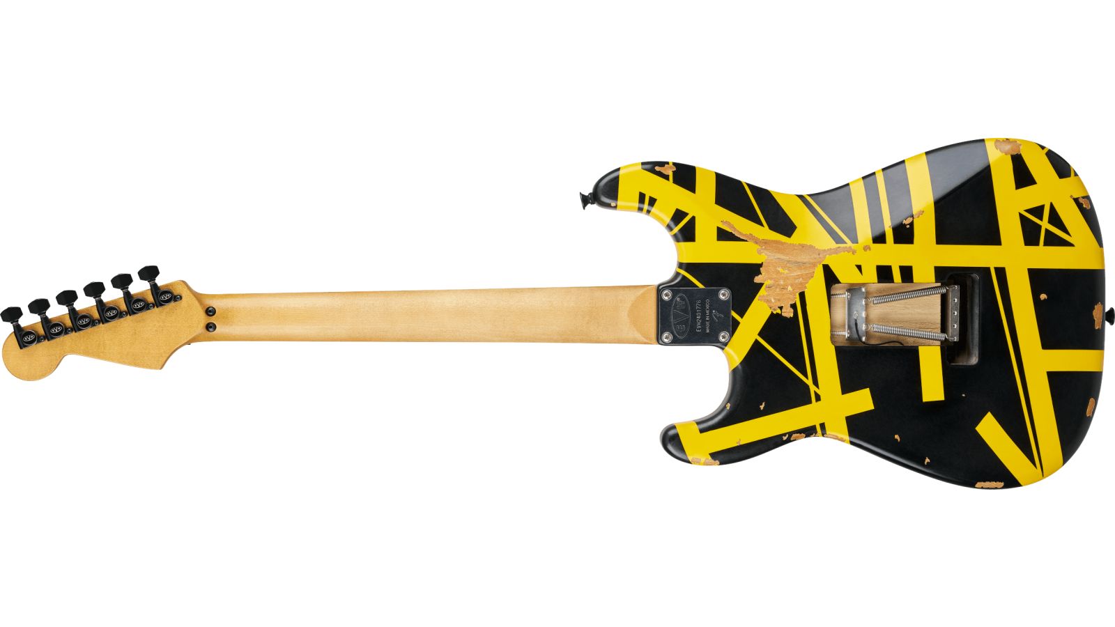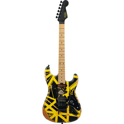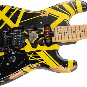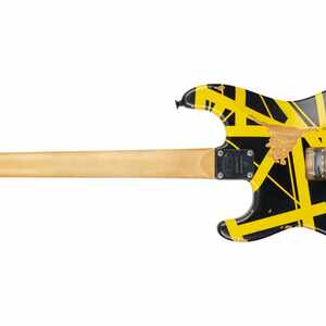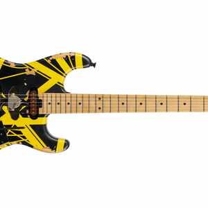 Die brandneue Frankie präsentiert sich in Eddies schwarz-gelber Lackierung und einem gealterten Look. Sie verfügt über einen Korpus aus Linde im Stratocaster-Stil und einen graphitverstärkten, geviertelten Ahornhals. Die geölte Halsrückseite sorgt für stundenlangen Spielkomfort, während das Ahorngriffbrett mit Compound-Radius von 12" bis 16" und 22 Jumbo-Bünden für schnelle und dynamische Spielstile konzipiert wurde.
