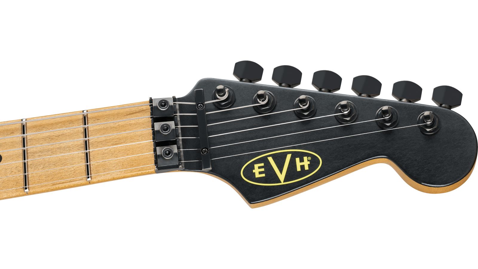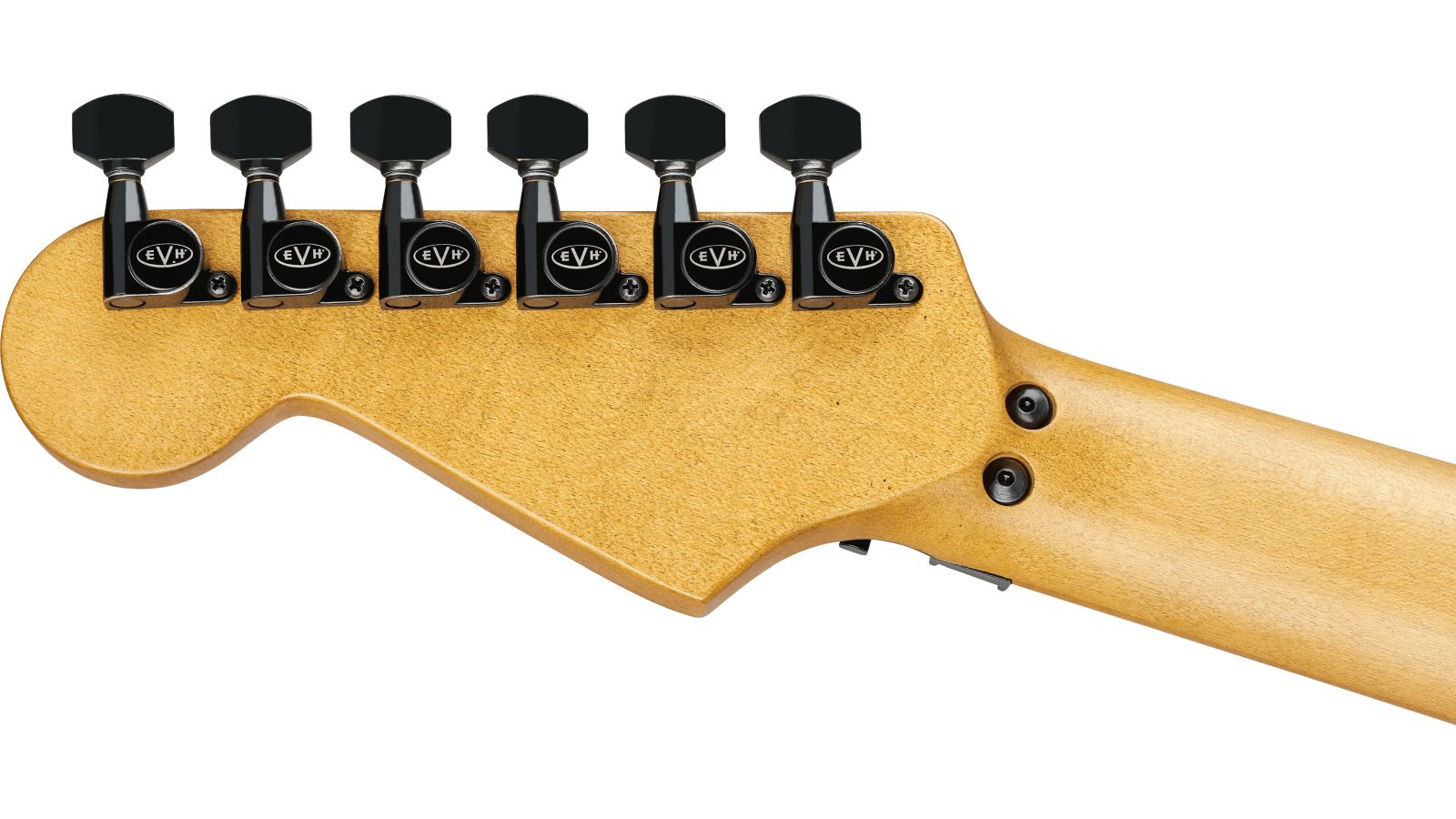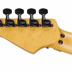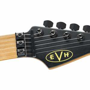 Weitere Besonderheiten sind der schwarze, umrandete Strat-Style-Push/Push-Lautstärkeregler (mit der Bezeichnung „Tone“), das schwarze Custom-Schlagbrett, die gealterte schwarze Hardware, die übergroßen Gurtknöpfe und die EVH-Halsplatte.