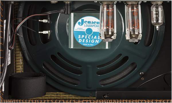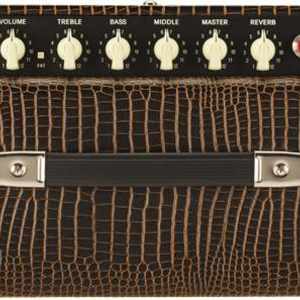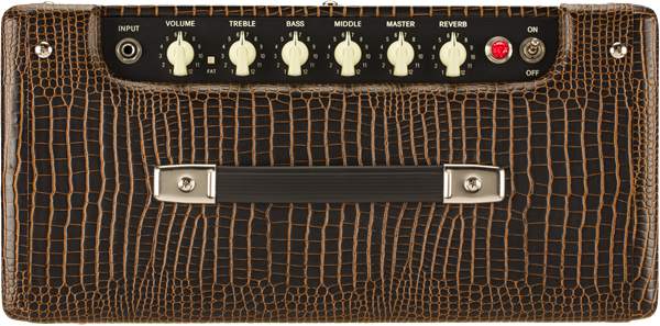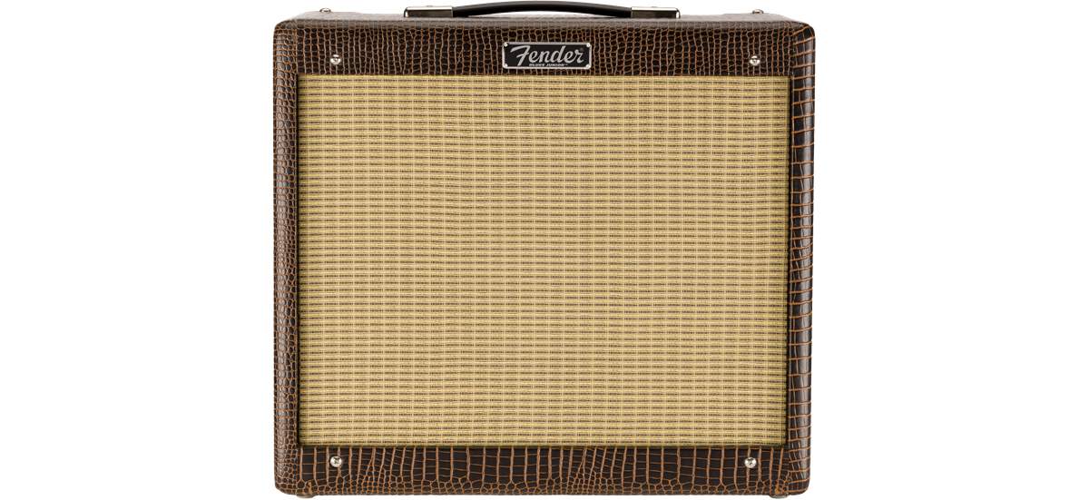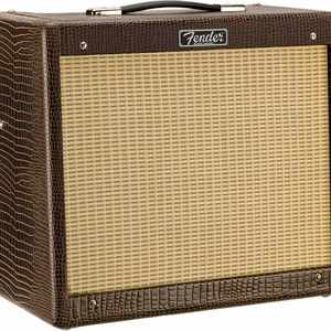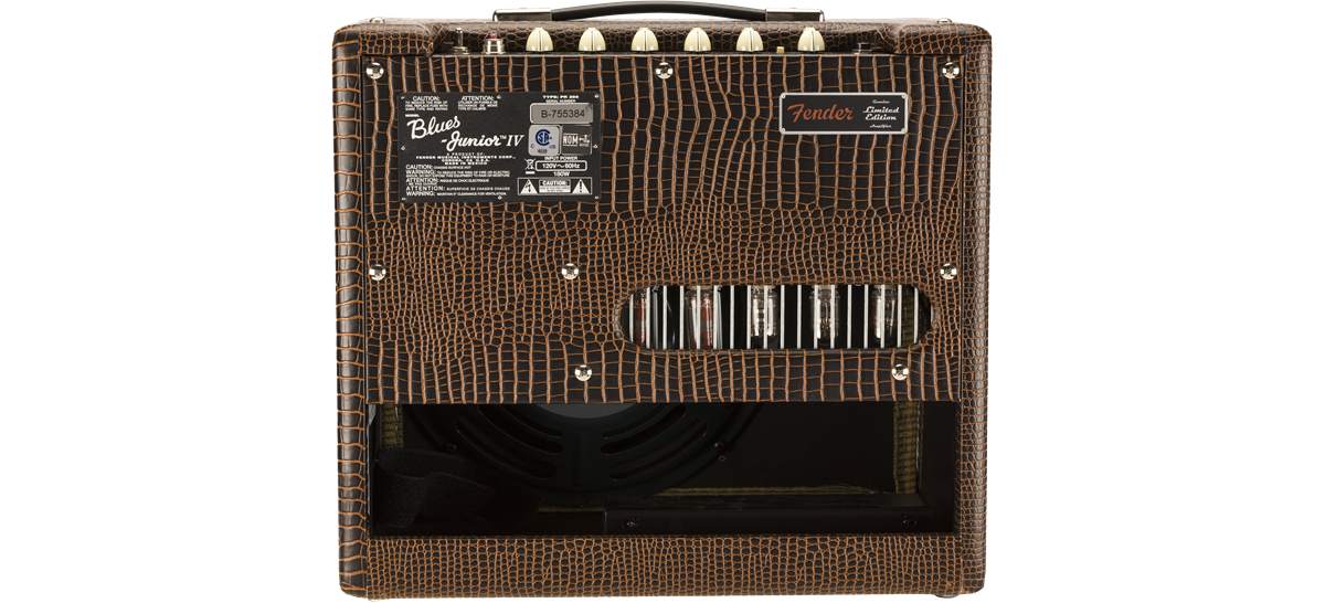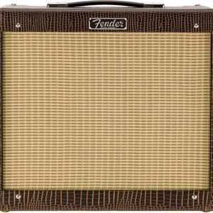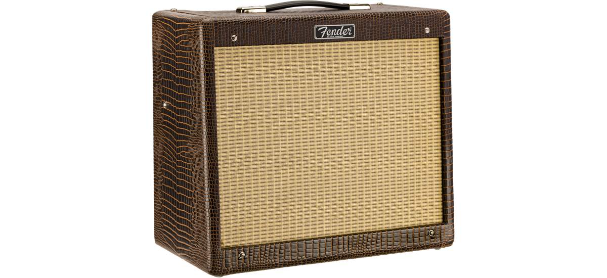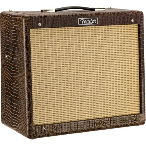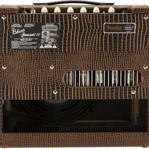 limitiertes Blues Junior Modell (FSR2019) mit modifizierter Vorverstärkerschaltung, einen weicheren Federhall, Jensen® P12Q-Lautsprecher und optisch mit braunen Alligator-Vinyl und beigen Front-Grill.