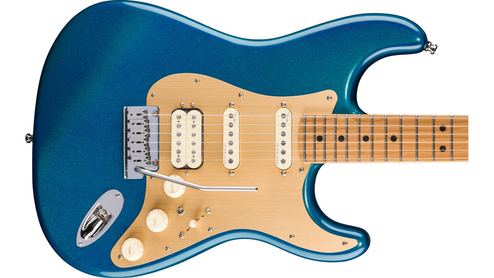 Im Inneren sorgen zwei Ultra II Noiseless Hot Strat Pickups in Kombination mit einem Haymaker Humbucker für ein breites Klangspektrum – von kristallklaren Cleansounds bis hin zu durchsetzungsstarken Leads – ganz ohne Brummen. Unser patentierter S-1-Schalter teilt den Haymaker-Tonabnehmer intelligent auf und sorgt so für noch mehr Klangvielfalt. Der Ultra Blaster-Vorverstärker liefert per Knopfdruck einen warmen und druckvollen dB-Boost. Weitere Merkmale für den professionellen Tourbetrieb sind das synchronisierte 2-Punkt-Tremolo American Ultra mit Einsteckhebel, polierte Edelstahl-Saitenreiter, ein Block aus kaltgewalztem Stahl, Deluxe-Locking-Mechaniken, Soft-Touch-Knöpfe und ein einlagiges, eloxiertes Aluminium-Schlagbrett.