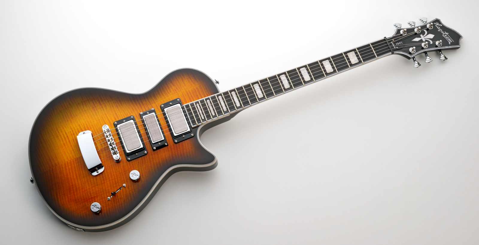 Tonabnehmer: 2x Lundgren Design, Model 2 AlNiCo Hals, Model 5 AlNiCoSteg, 1x H52 AlNiCo Mini Humbucker Mitte, alle mit speziellen „Shaver Grill“ Tonabnehmer Kappen