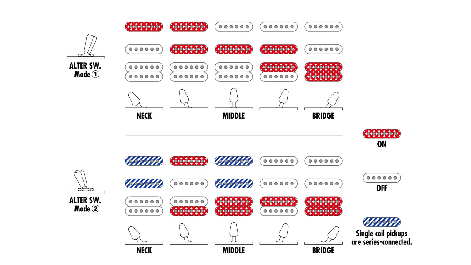 • Schaltungselemente: 1 Lautstärke, 1 Klang, Fünfwegeschalter