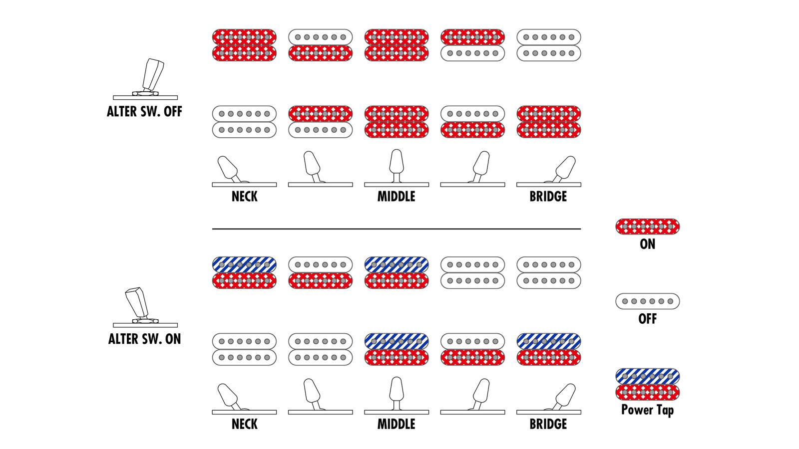 - Schaltungselemente: 1 Lautstärke, 1 Klang, Fünfwegeschalter