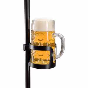 Praktischer, robuster Getränkehalter zum Anklemmen an Rohre (bis Ø 30 mm). Ideal für Maßkrüge, Bierseidel, große Flaschen, Gläser und Tassen mit einem Maximaldurchmesser von 116 mm. Schwarz pulverbeschichtet für langlebigen Korrosionsschutz und ein unauffälliges, edles Erscheinungsbild.