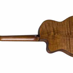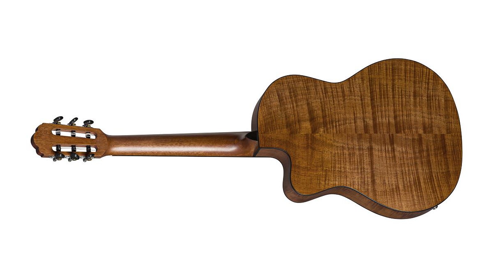 Die massive deutsche Fichtendecke sorgt für einen klaren, warmen Klang, während Boden und Zargen aus geflammtem Okoume dem Instrument eine elegante Optik und natürliche Resonanz verleihen. Der Hals aus Mahagoni mit einem schlanken, schmalen Profil und einem Radius von 380 mm bietet ein komfortables Spielgefühl, perfekt auch für schnelle Passagen.