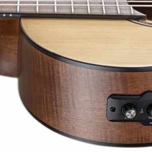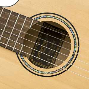 Das Griffbrett und der Steg sind aus Ovangkol gefertigt, mit Nubone Sattel und Stegeinlage für eine optimale Klangübertragung. Die Mechaniken sind nickelplattiert und mit schwarzen Flügeln ausgestattet, was der Gitarre einen klassischen Look verleiht.