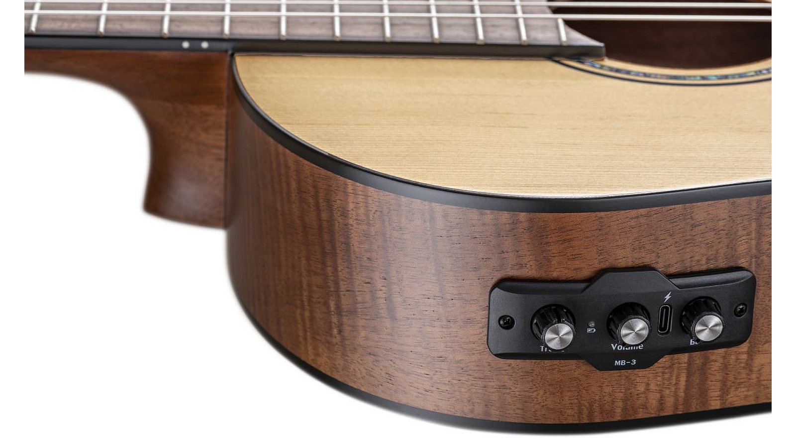 Für den Einsatz auf Bühne oder bei Aufnahmen ist die Gitarre mit dem hochwertigen MB-3 Rechargeable Tonabnehmer-System ausgestattet. Die Mensur beträgt 650 mm, die Sattelbreite 48 mm – ideale Maße für Konzertgitarren. Gespannt wird die La Mancha C-Lime-TN-CER mit hochwertigen Savarez Saiten.