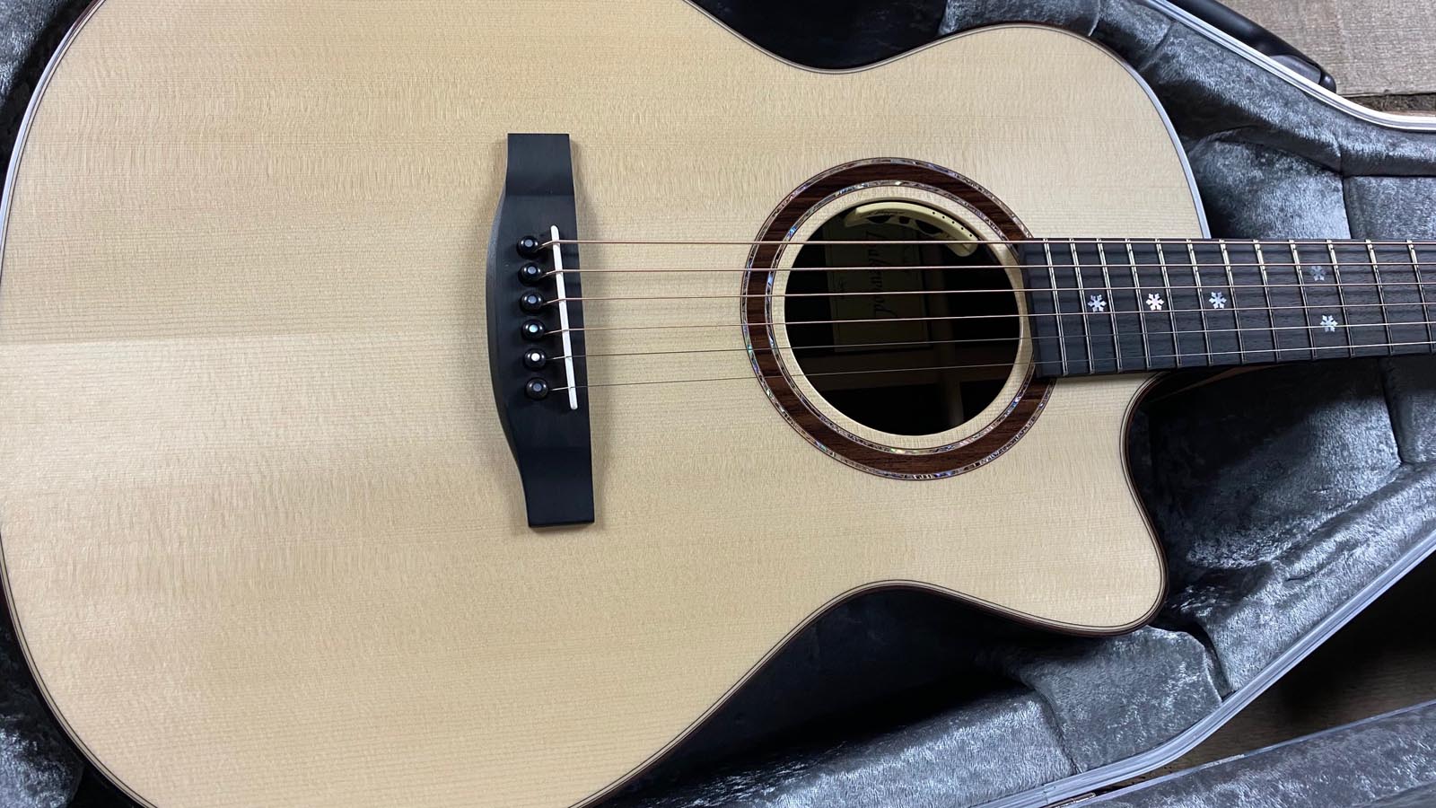 - Schalllochverzierung: Holzkern mit Abaloneringen