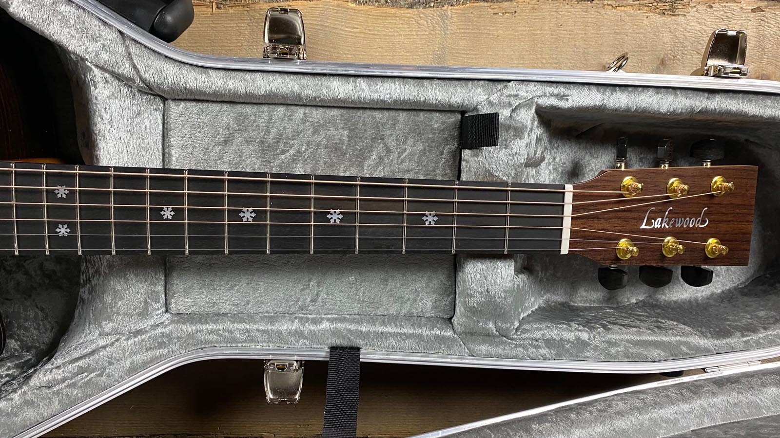 - Kopfplatteneinlagen: Lakewood Logo aus weißem Perlmutt