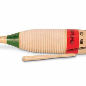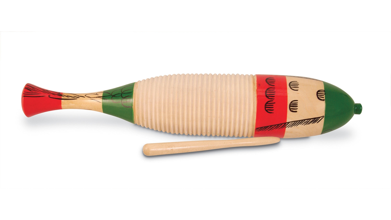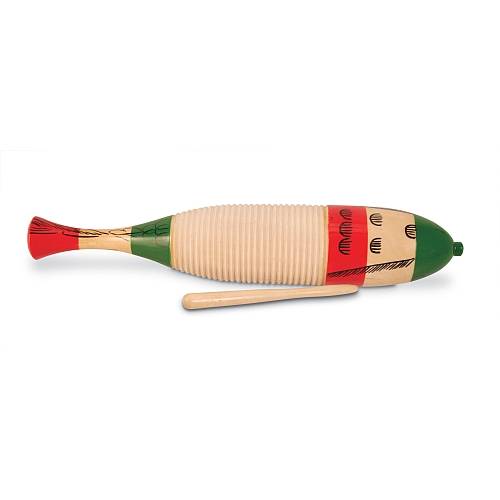 - Ähnlich dem zylinderförmigen Güiro, jedoch in dekorativer Fischform