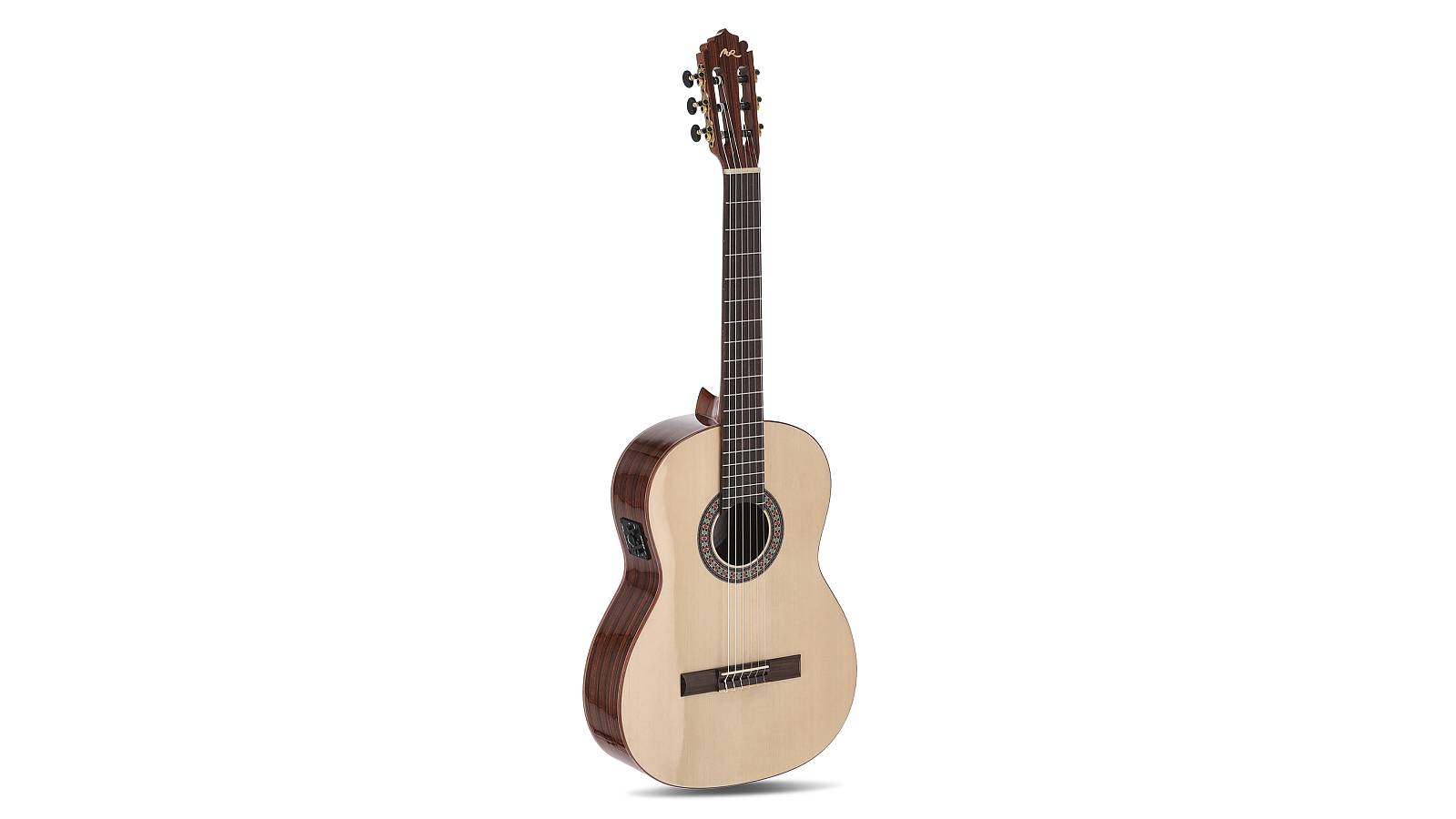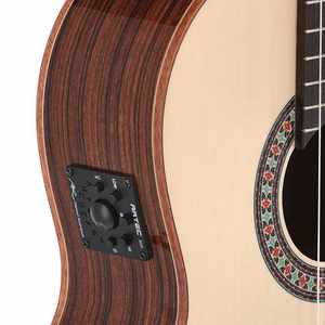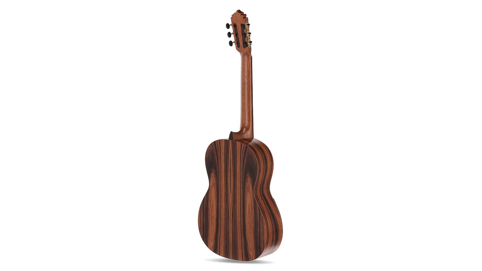 Die Santos Pavo Real setzt auf massive europäische Fichte für die Decke und auffällig gemaserten Santos Palisander für Boden und Zargen. Die Kombination aus hellen und dunklen Hölzern ergibt nicht nur einen edlen Look, sondern auch einen klaren, ausgewogenen Klang – ideal für klassische Stücke, Fingerstyle oder moderne Nylon-Sounds.