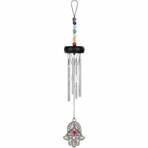Mit seinen sieben farbigen Steinen, die die Chakren symbolisieren, und dem Hamsa-Symbol als Zeichen für Schutz und positive Energie ist dieses Windspiel nicht nur ein dekoratives Highlight, sondern auch ein spirituell bedeutungsvolles Klangobjekt.