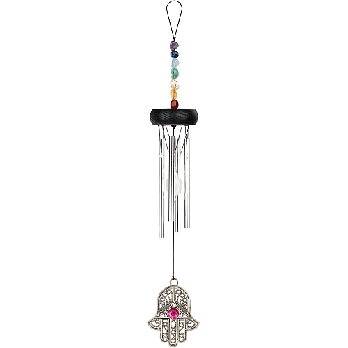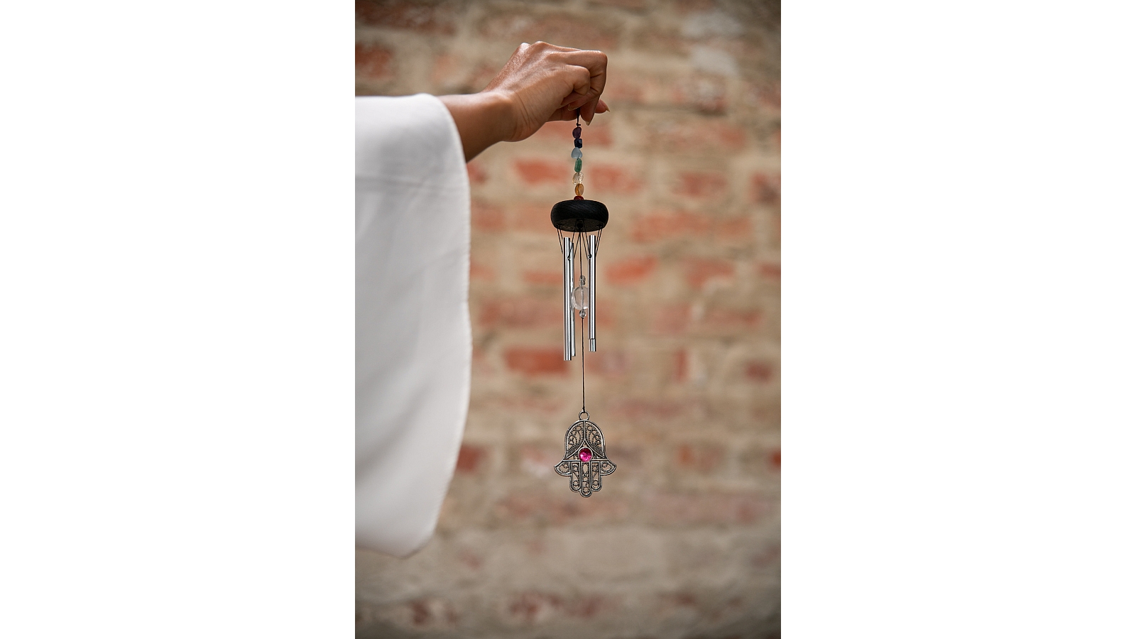 Mit seinen sieben farbigen Steinen, die die Chakren symbolisieren, und dem Hamsa-Symbol als Zeichen für Schutz und positive Energie ist dieses Windspiel nicht nur ein dekoratives Highlight, sondern auch ein spirituell bedeutungsvolles Klangobjekt.