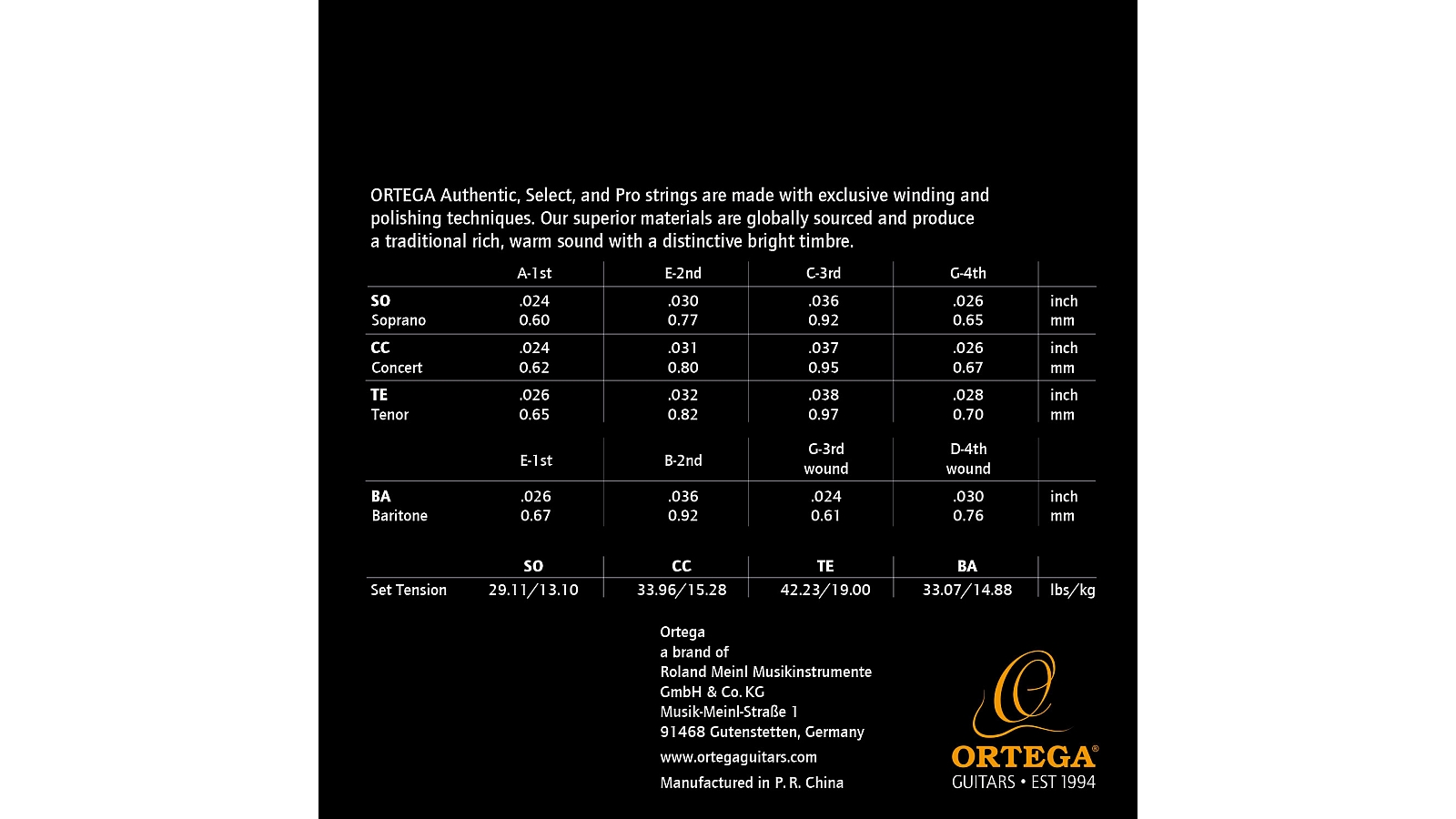 Die ORTEGA-Saiten werden mit exklusiven Wickel- und Poliertechniken hergestellt und überzeugen durch erstklassige Materialien, die weltweit bezogen werden. Das Ergebnis ist ein traditionell voller, warmer Klang mit einem klaren, hellen Timbre – perfekt abgestimmt auf die natürliche Charakteristik der Ukulele.