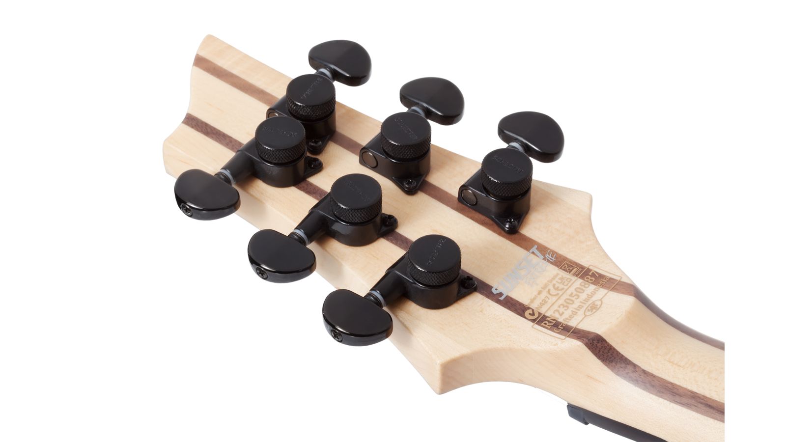 Die Sunset Extreme zeichnet sich durch ein sehr reduziertes Design unter Verwendung hochwertiger Hölzer und Komponenten aus. Eine edle Flamed Maple Decke auf dem Nyathoh-Korpus gepaart mit einem Ahorn-/Palisanderhals mit Ebenholzgriffbrett verleihen der Gitarre ein schickes Erscheinungsbild und bieten vielseitigen und ausgewogenen Sound. Die Schecter USA Sunset Strip und Pasadena Humbucker aus dem Customshop erledigen den Rest.