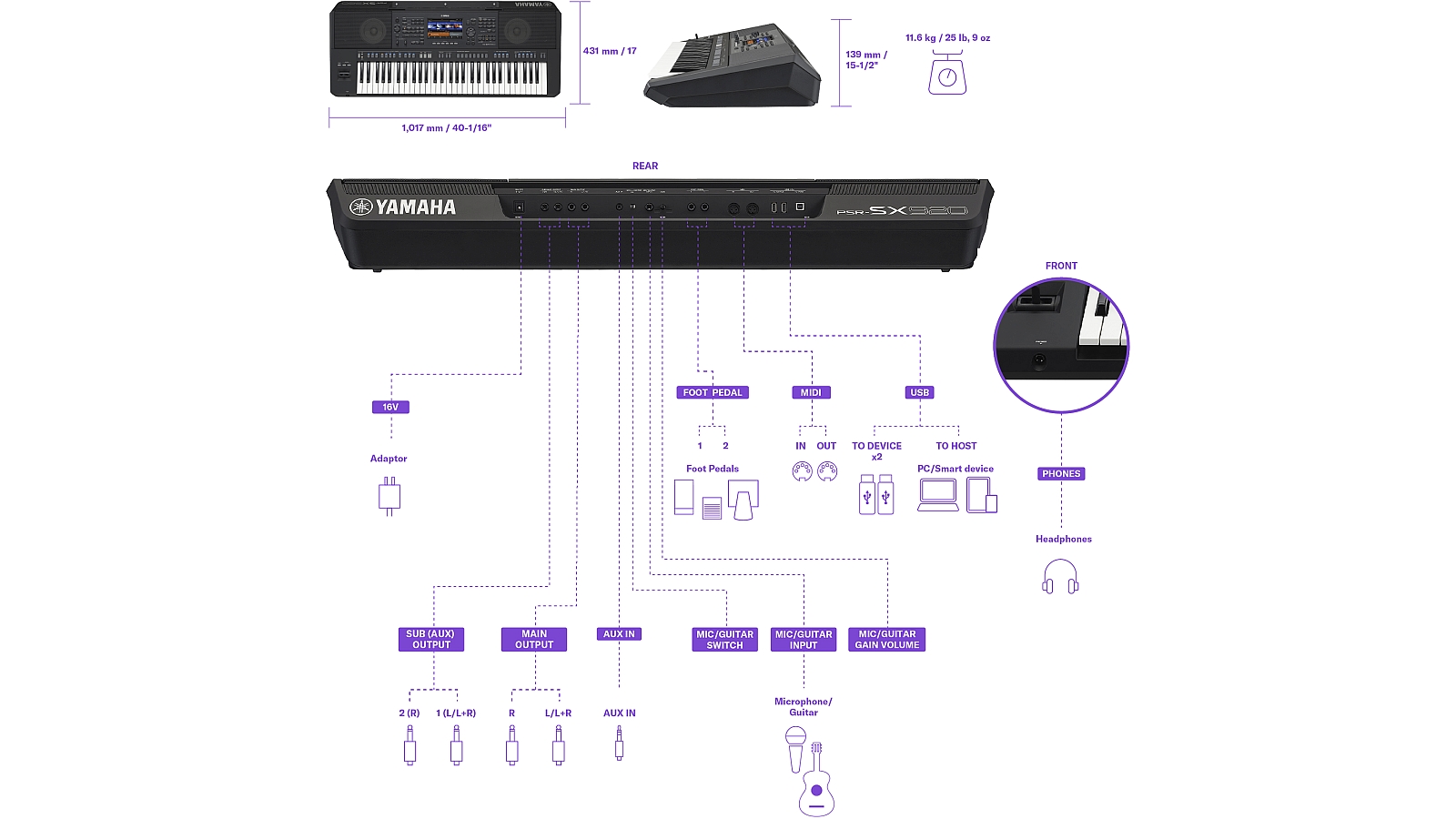 - Anschlüsse: USB to Host, USB to Device x2, Kopfhöreranschluss, AUX IN, MIDI (In/Out), Line Out (L/L+R, R), Pedale, Mikrofon/Gitarre, Bluetooth® Audio
