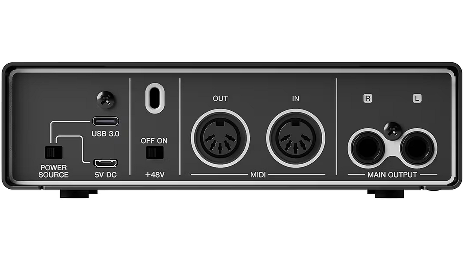 - 2 Combo-Eingänge (XLR/TRS) mit +48 V Phantomspeisung